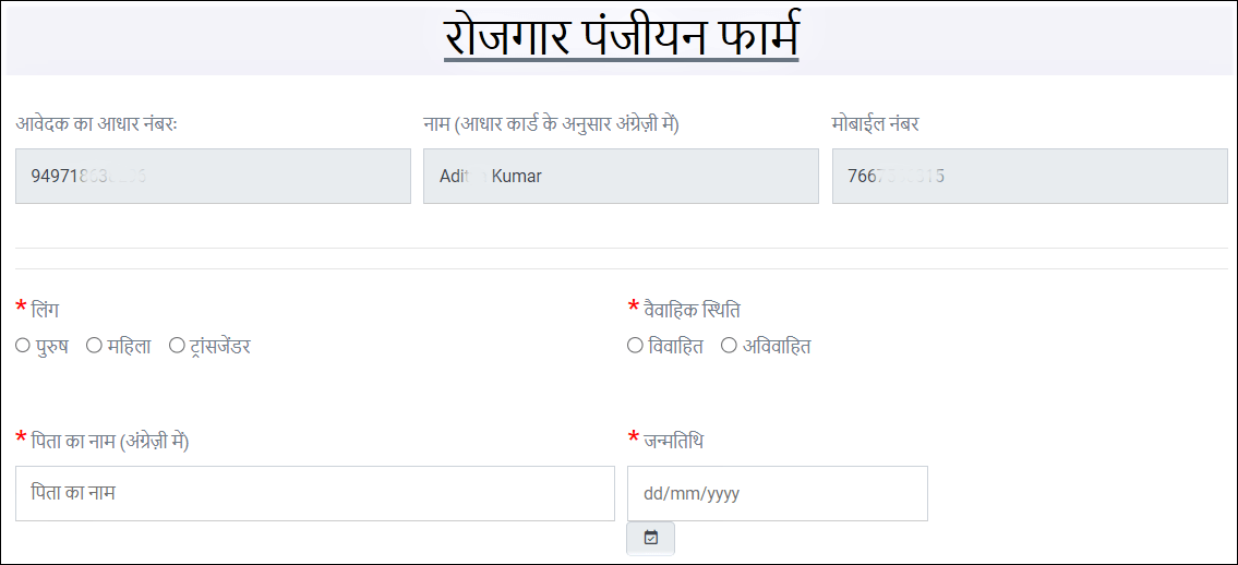 1. अब, रोजगार पंजीयन फॉर्म खुल जायेगा,जहाँ पर आधार संख्या,नाम और मोबाइल नंबर शो होगा।